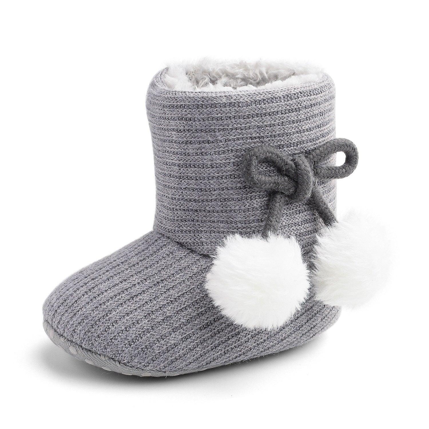 Gray knitted baby bootie with white fuzzy pom-poms and soft inner lining
