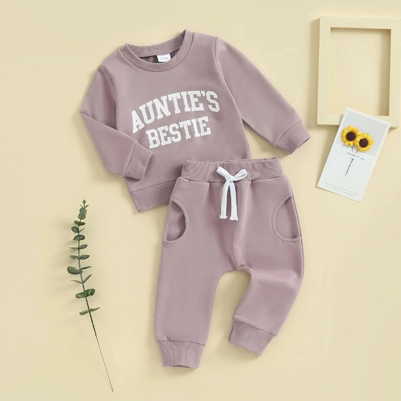 Mauve toddler sweatshirt and pants set with "Auntie's Bestie" text, laid flat on beige background