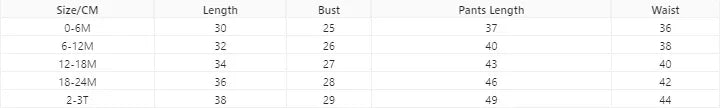 Size chart for baby clothes showing length, bust, pants length, and waist measurements in centimeters for ages 0-3T