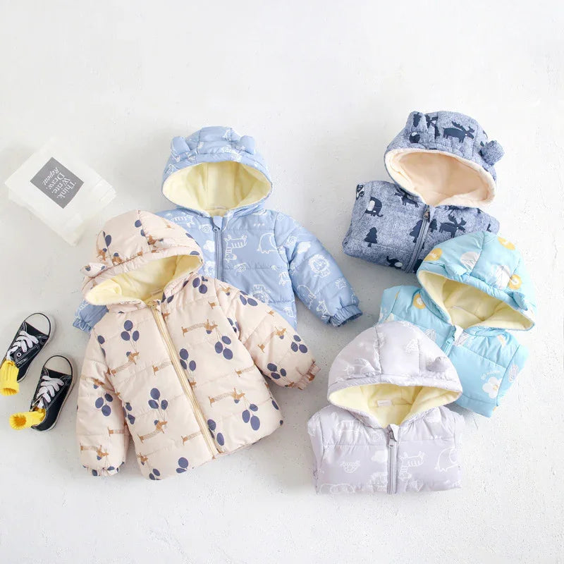 Four colorful baby hooded puffer jackets with animal and floral prints, soft lining, and bear ears on hoods