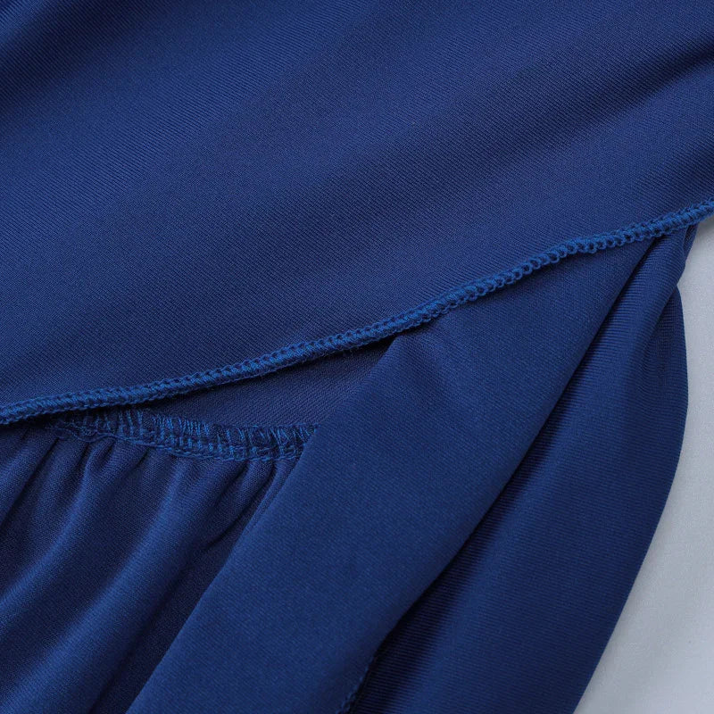 Close-up of navy blue fabric with elastic stitching and layered seams detail