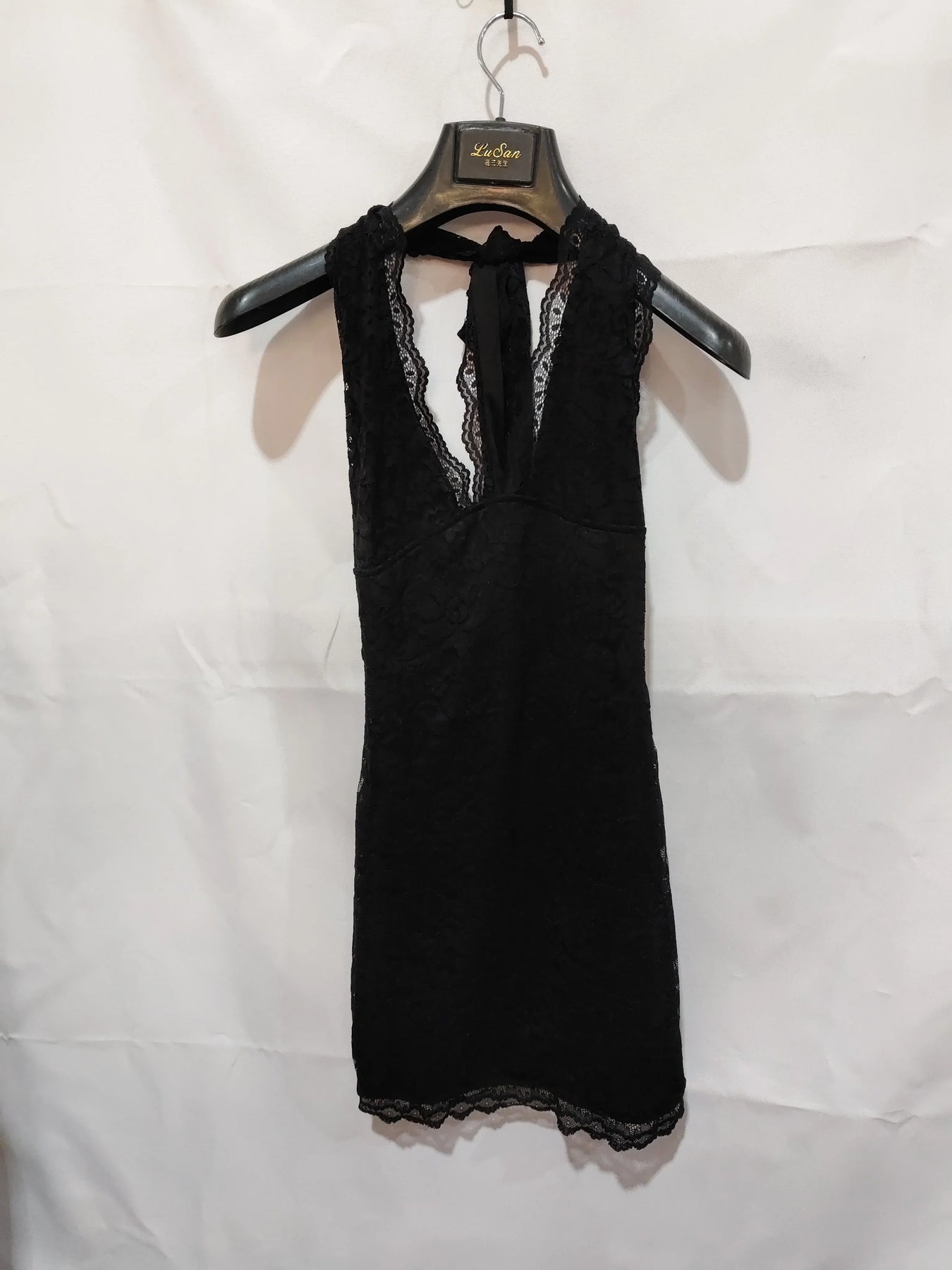 Black lace sleeveless dress with deep V-neckline hanging on LuSan branded hanger against white background