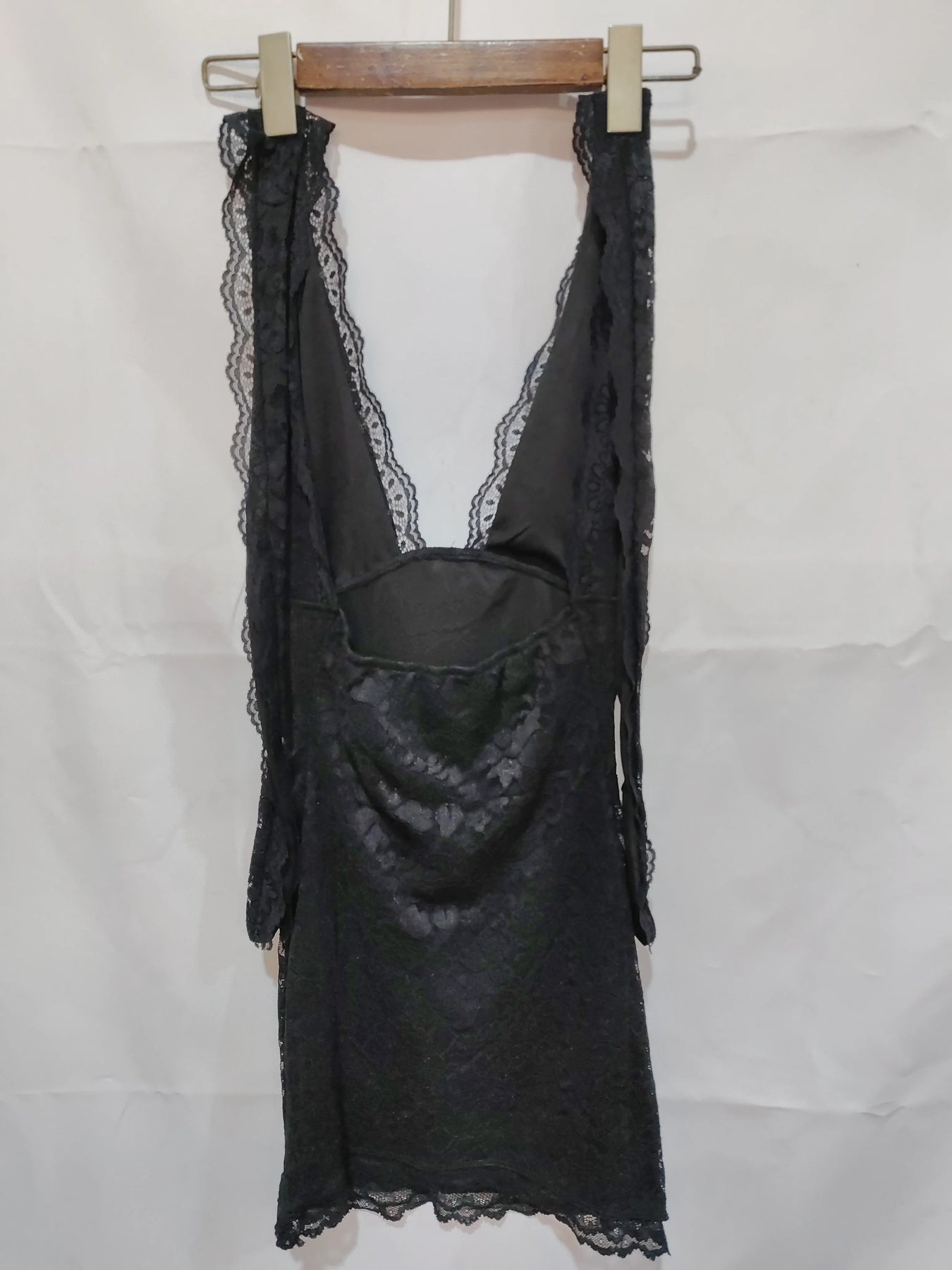 Woman in black lace halter mini dress with scalloped hem and ponytail hairstyle indoors