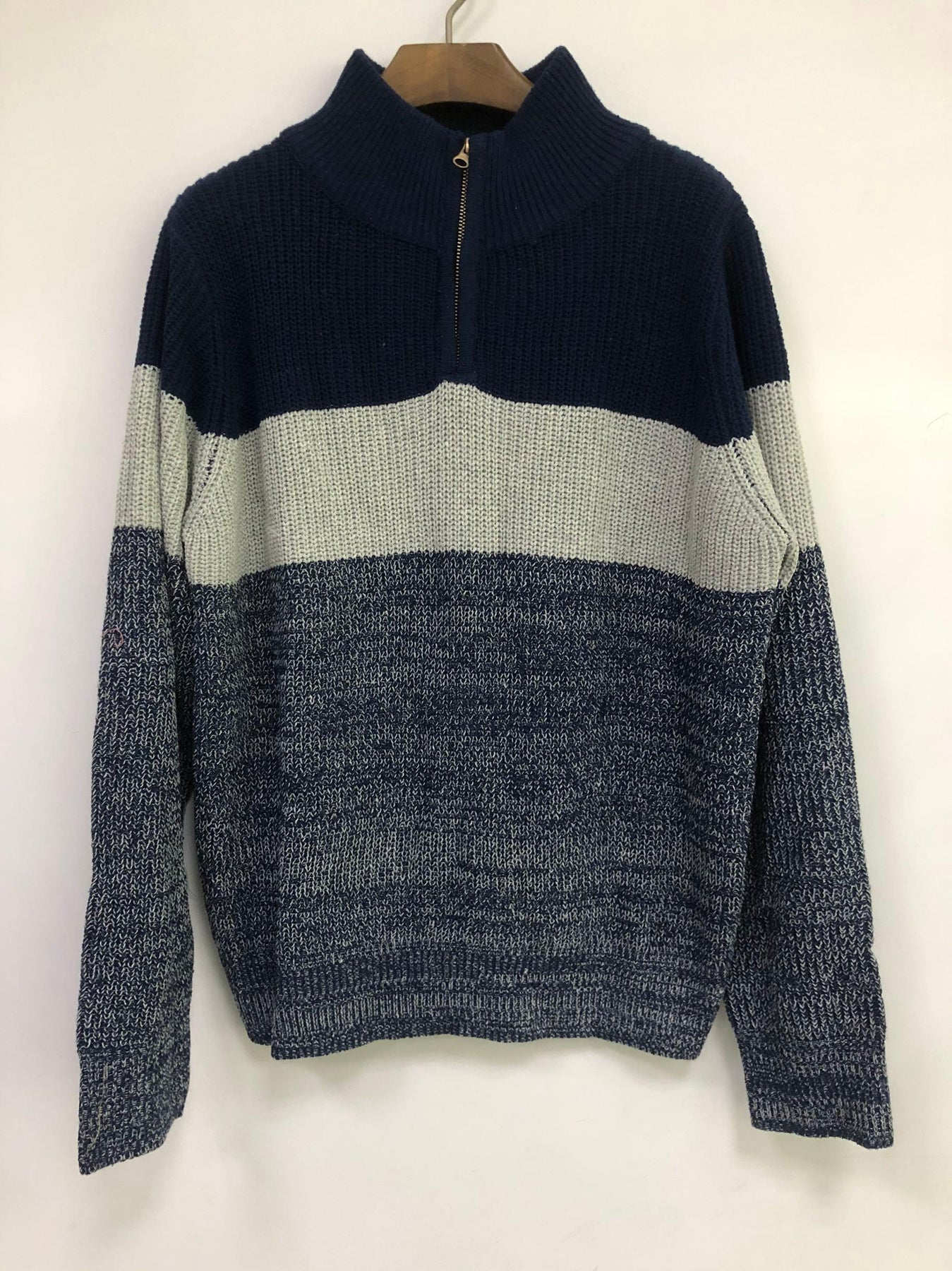 Men's colorblock knit sweater with navy blue, light gray, and marled navy stripes, half-zip collar
