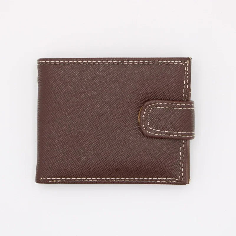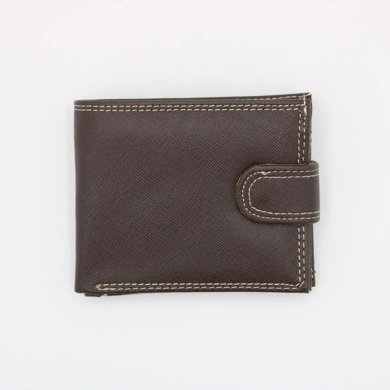 Dark brown leather wallet with white stitching and snap button closure on white background