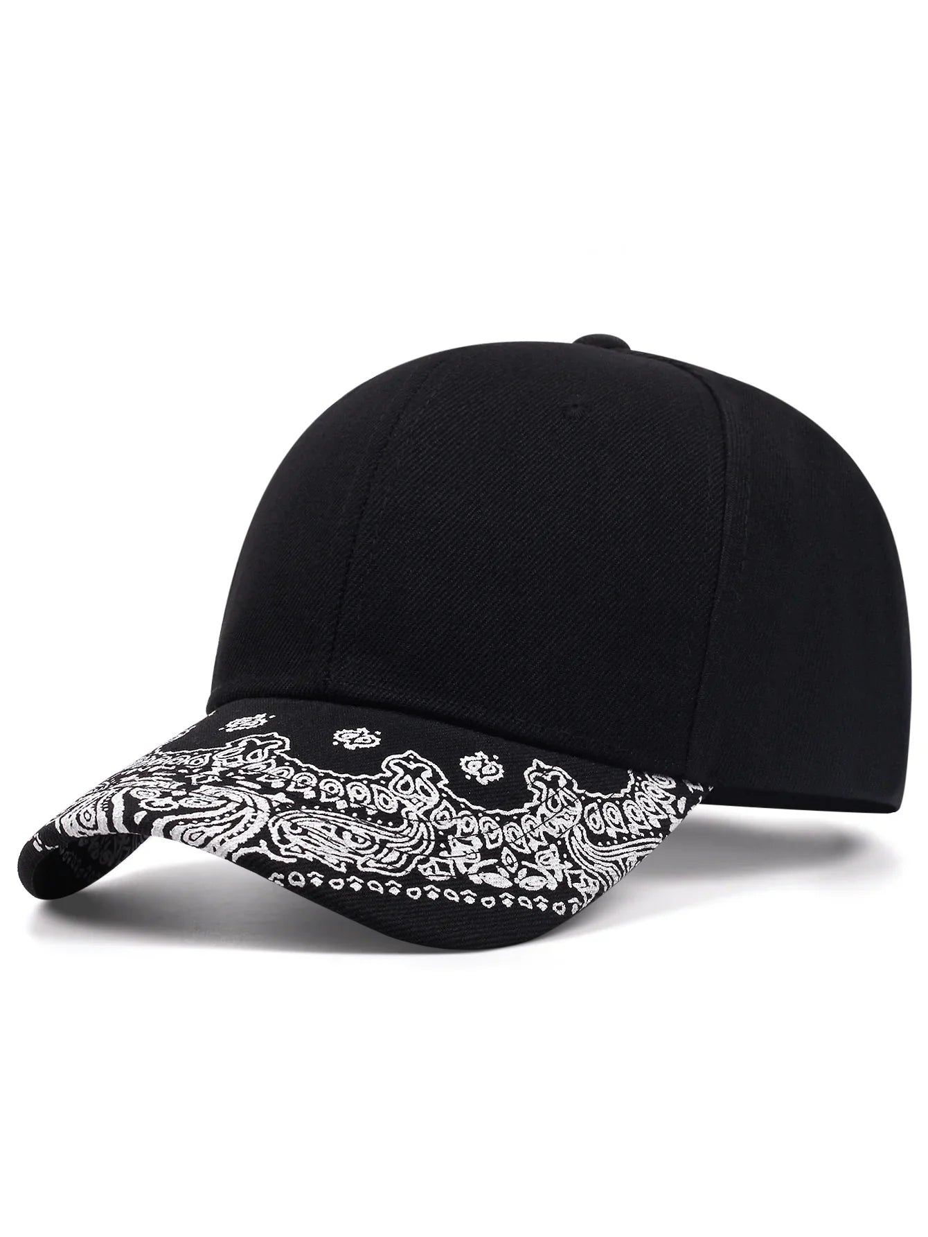 Black baseball cap with a black and white paisley bandana print on the curved brim