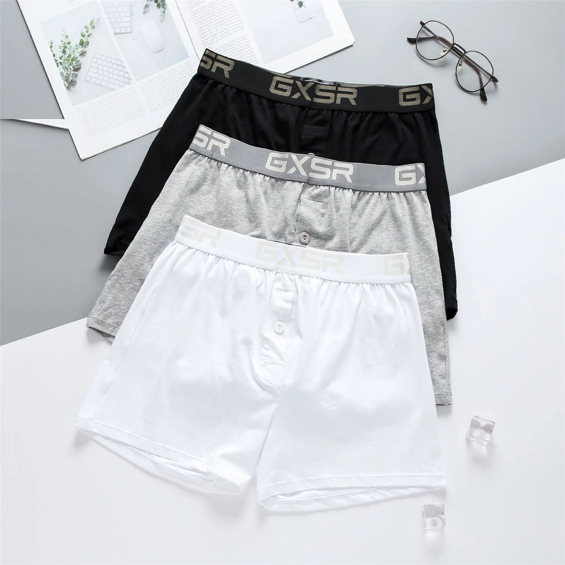 Three pairs of GXSR men's boxer shorts in white, gray, and black on gray and white background with glasses and magazine