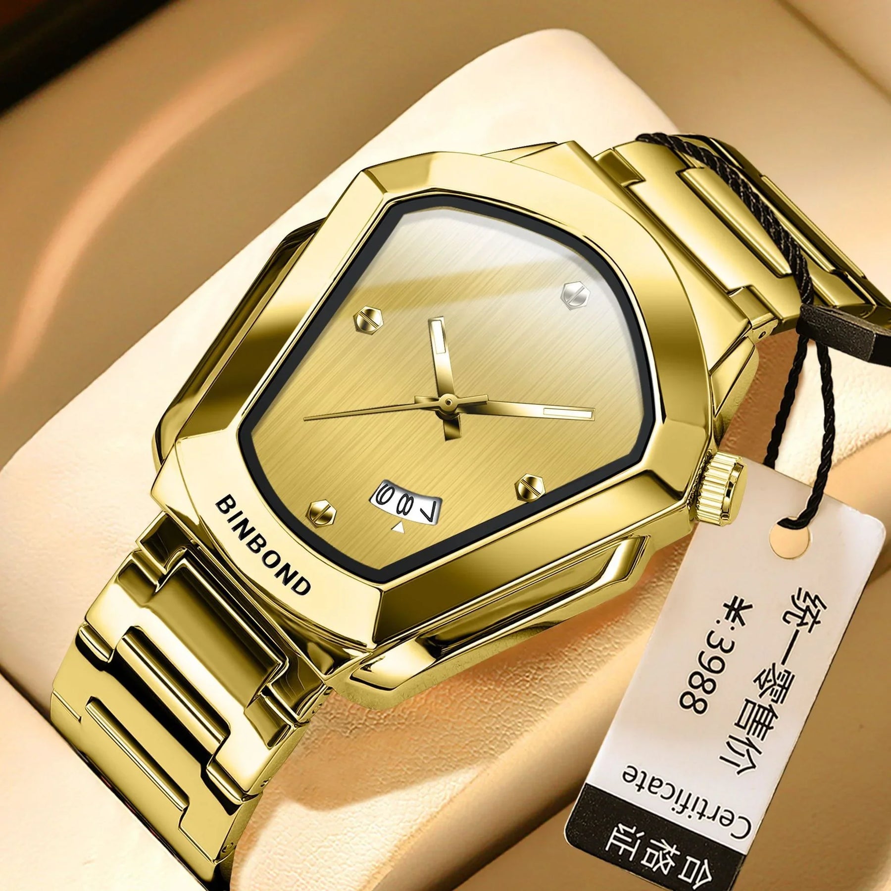Gold-toned BINBOND wristwatch with unique angular case, metal bracelet, date display, and black tag
