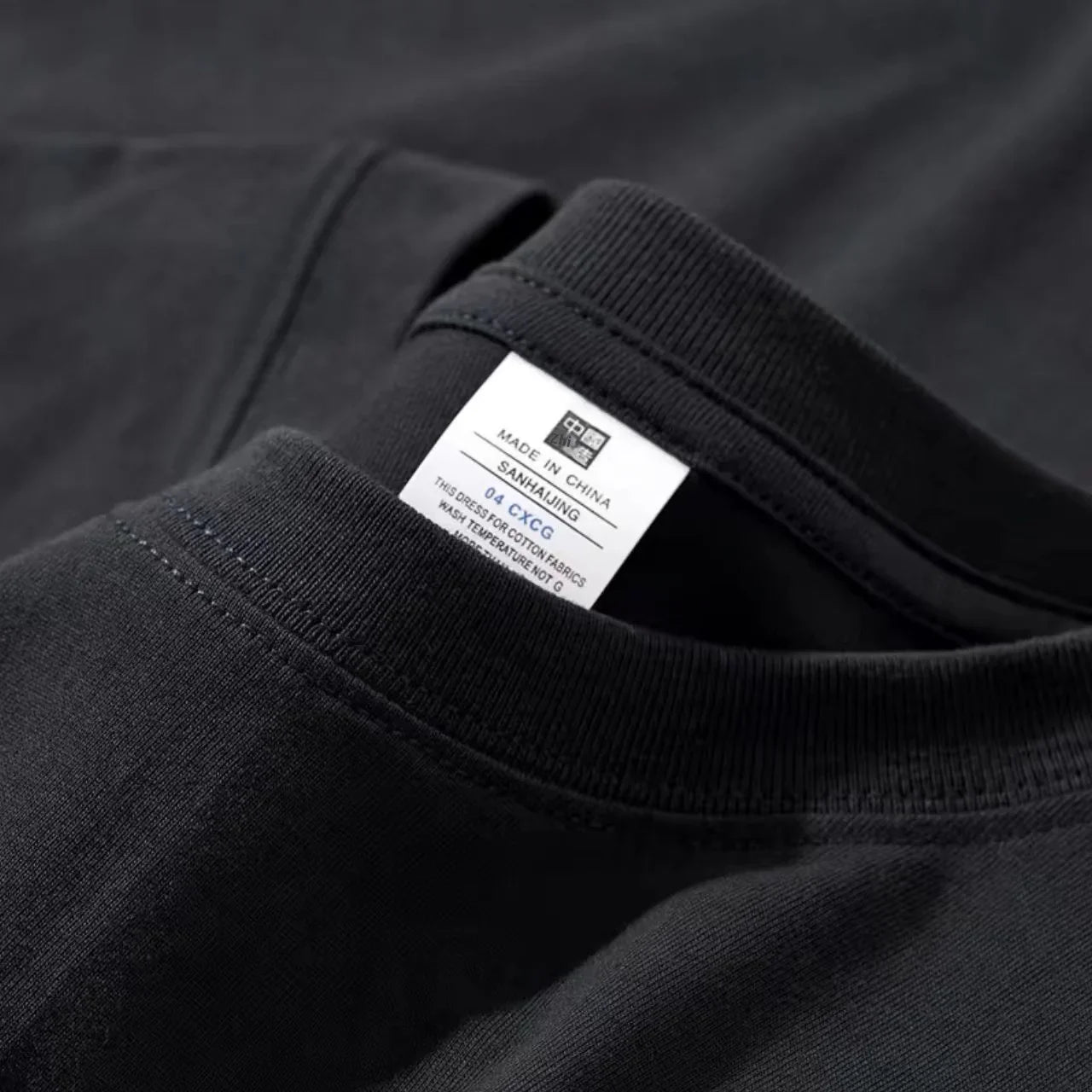 Close-up of a black cotton t-shirt neck with a white label showing washing instructions and made in China tag