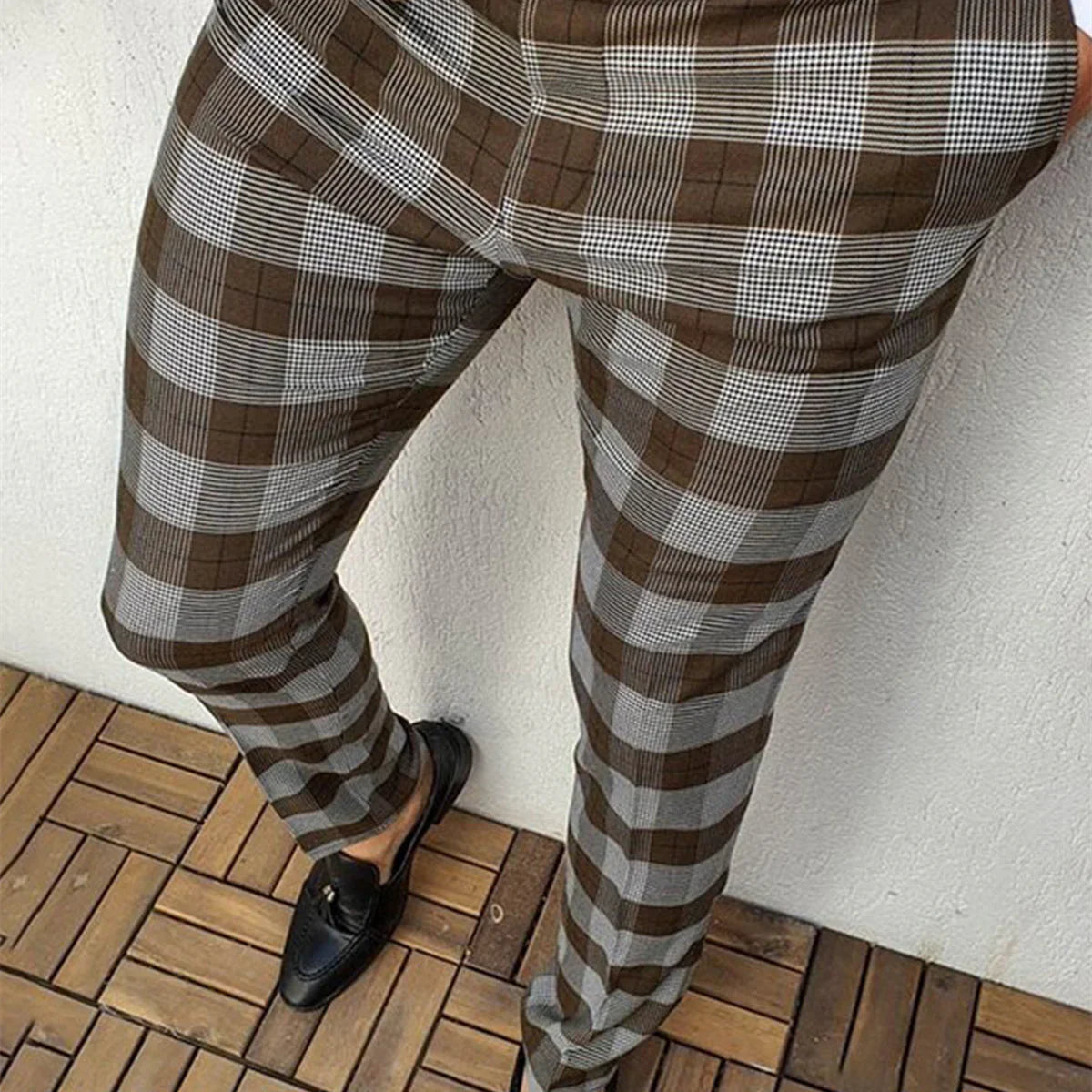 Man wearing brown plaid slim-fit dress pants with red button and beige brown loafers standing on concrete