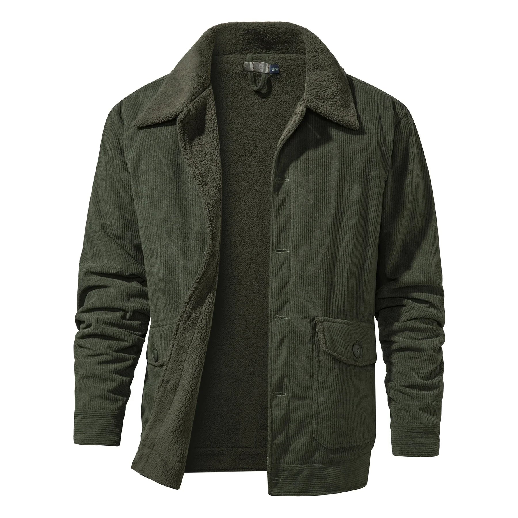 Men's olive green corduroy jacket with sherpa lining and flap pockets