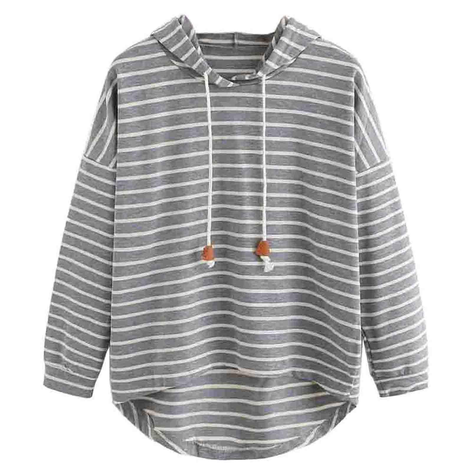 Gray and white striped casual hoodie with long sleeves and drawstring hood