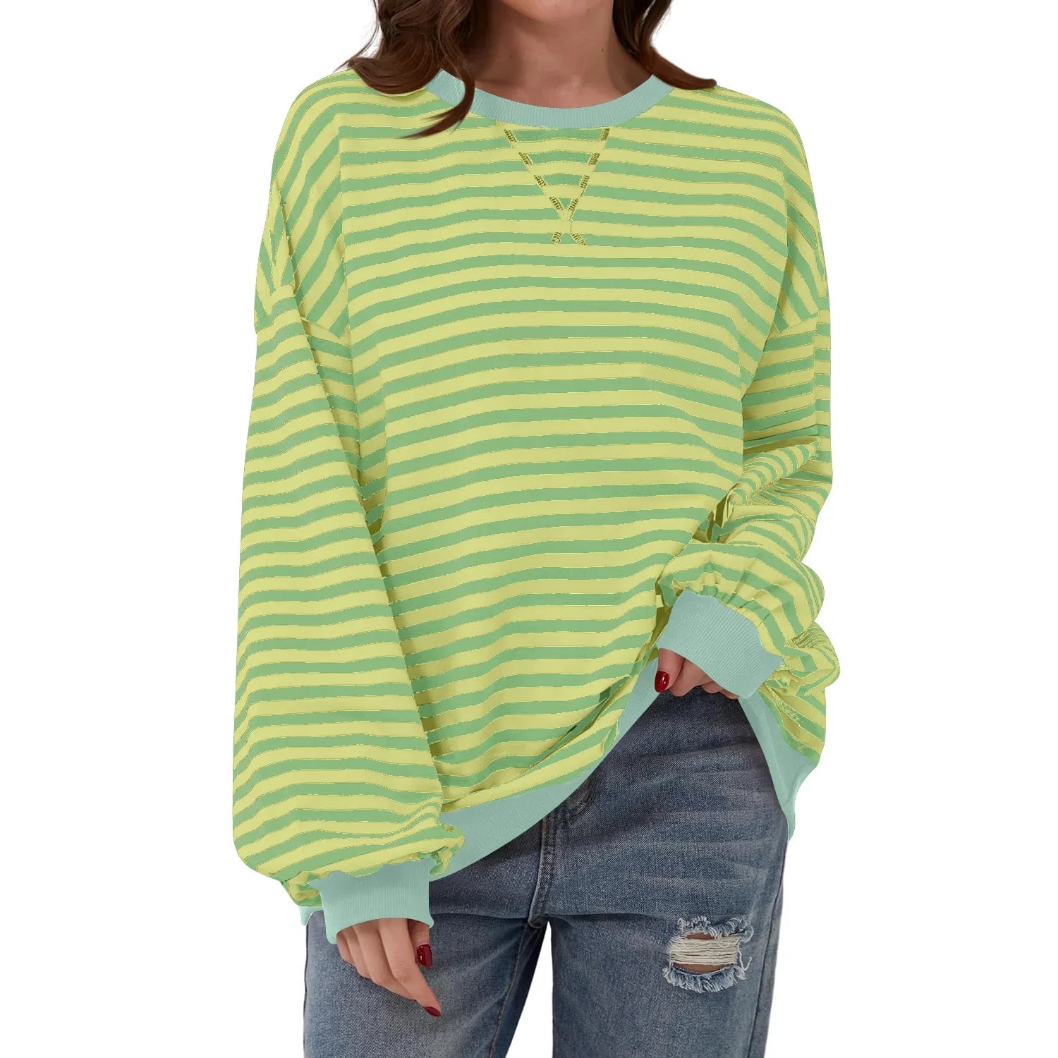 Woman wearing oversized yellow and green striped sweatshirt with light blue cuffs and ripped jeans