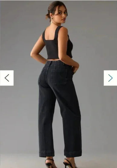 Back view of woman wearing high-waisted wide-leg blue denim jeans with front patch pockets