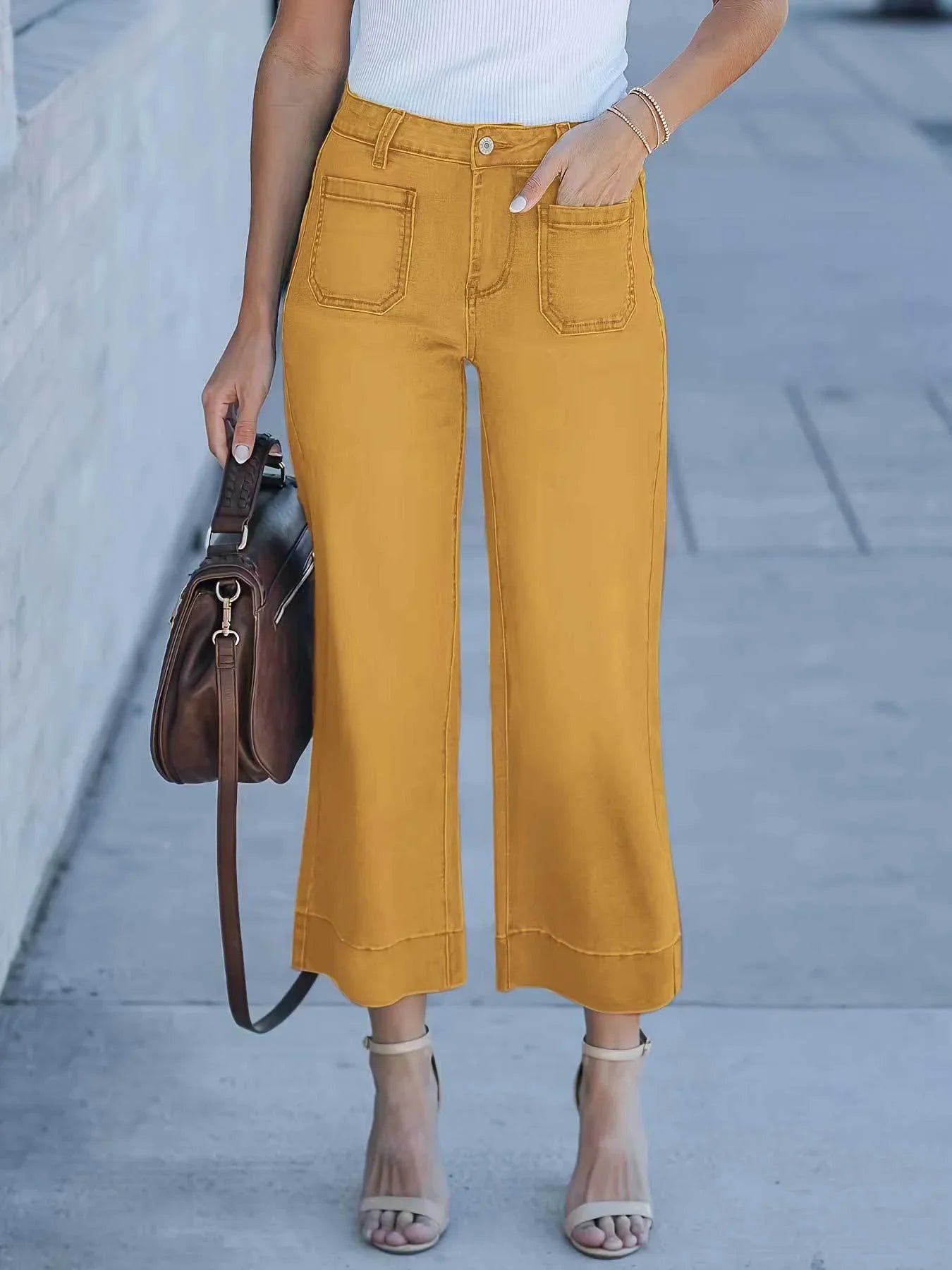 Woman wearing mustard wide-leg jeans with large front pockets, white top, holding brown leather bag