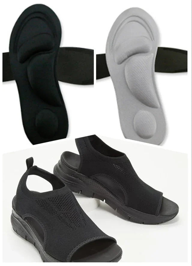 Black open-toe summer sandals with breathable upper and cushioned insoles in black and white