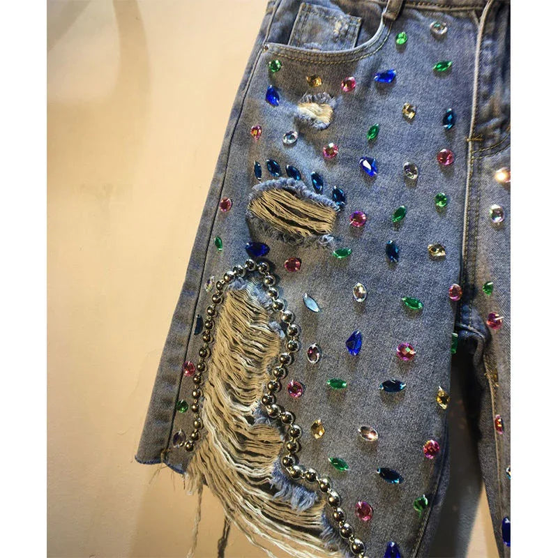 Distressed denim shorts embellished with colorful rhinestones and silver ball chain accents
