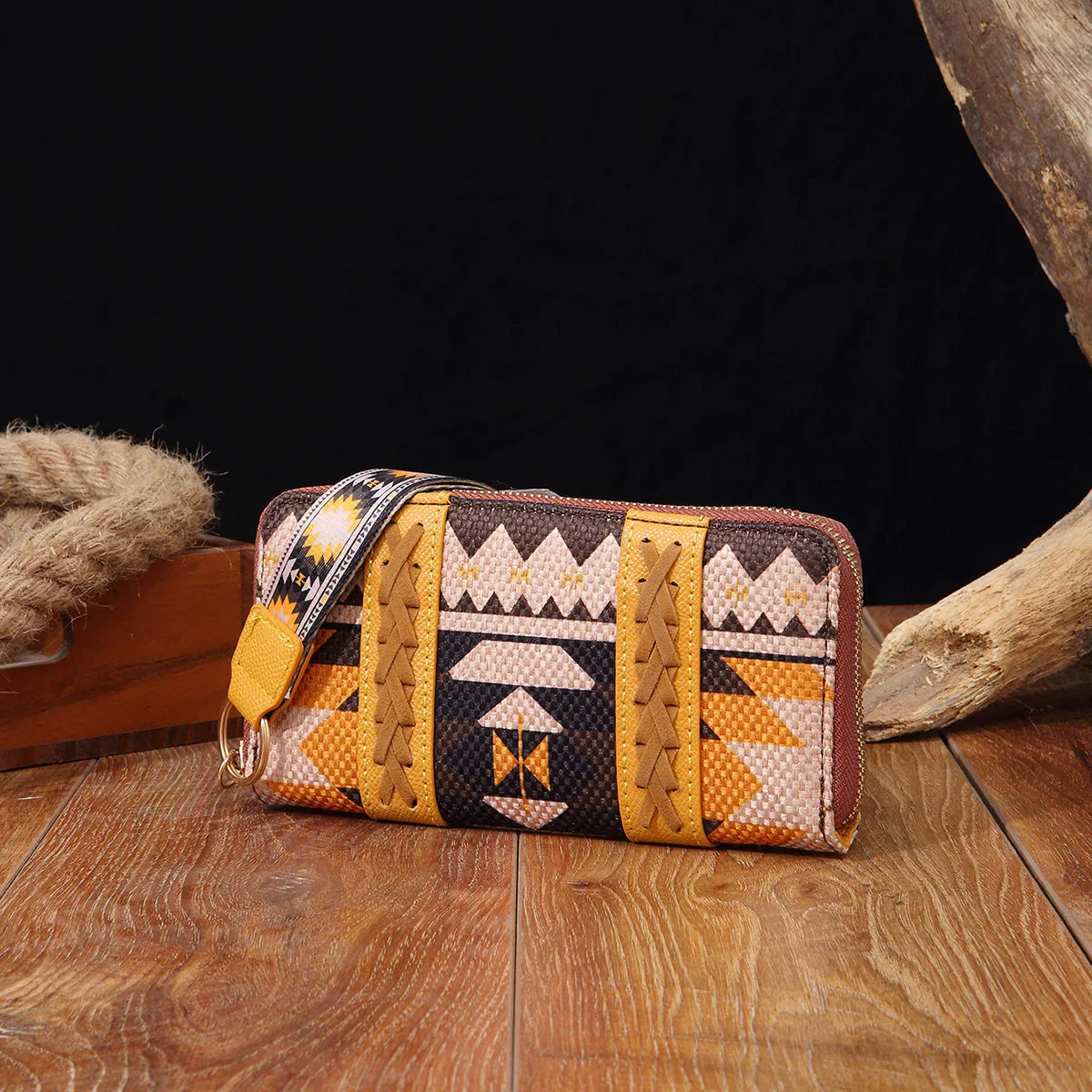 Bohemian-style wristlet wallet with geometric southwestern patterns and leather braided details