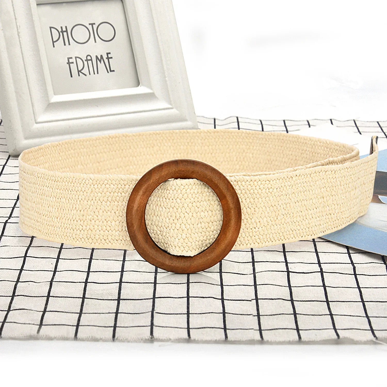 Beige woven belt with round wooden buckle placed on black and white grid fabric