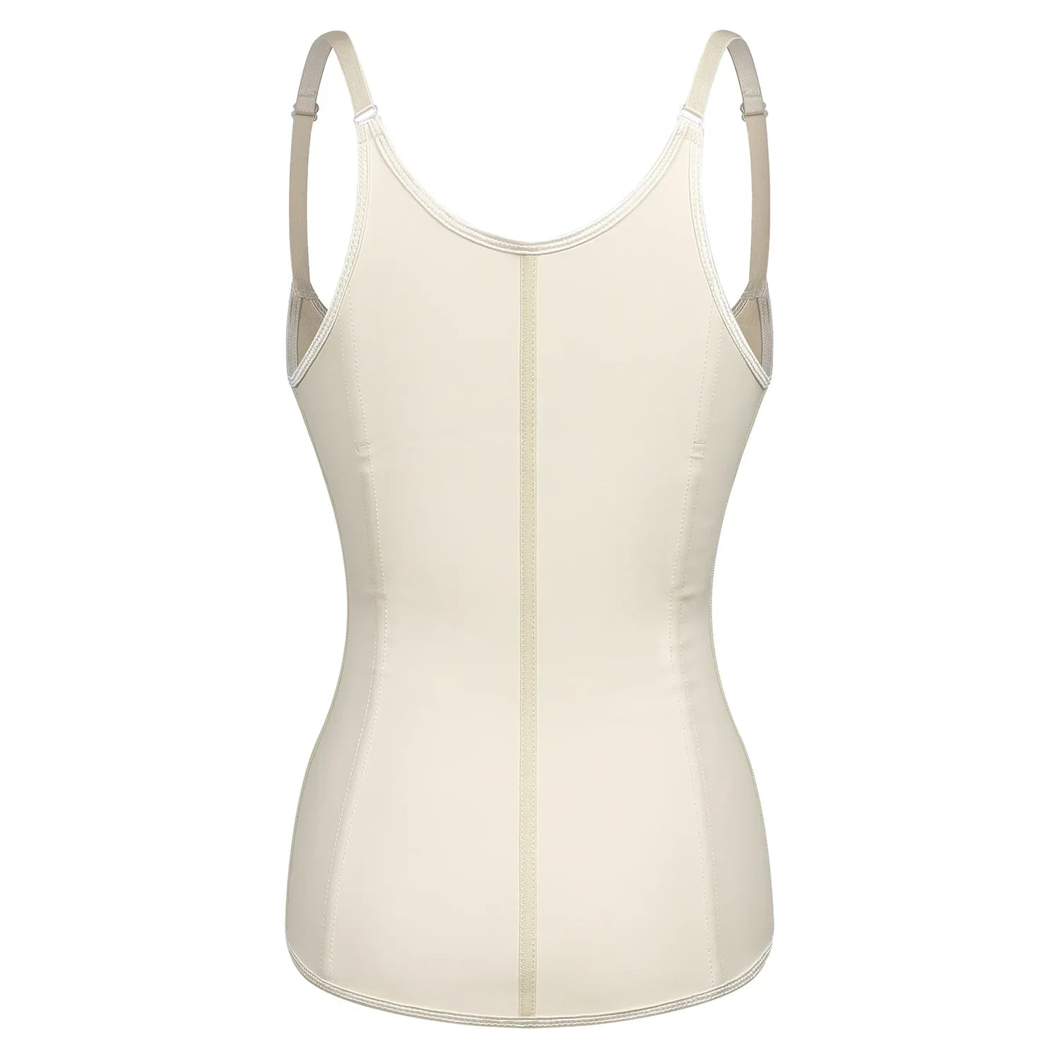 Beige women's shapewear vest with adjustable straps and front zipper closure