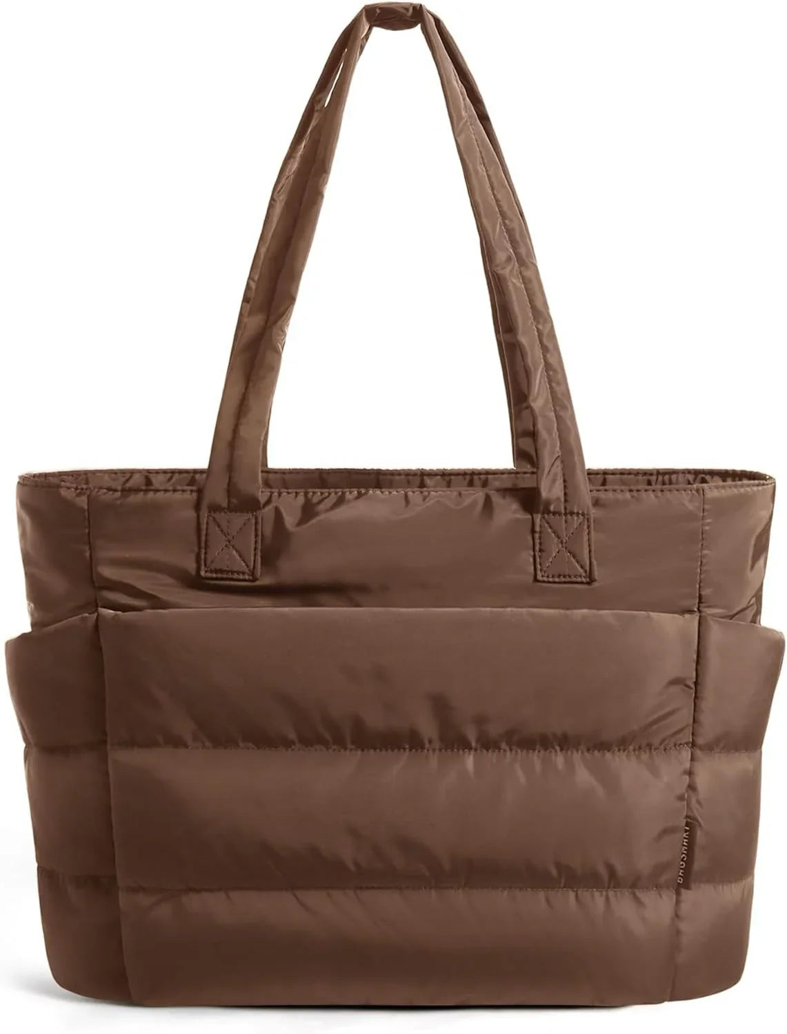 Brown quilted puffer tote bag with long handles and side pockets on white background