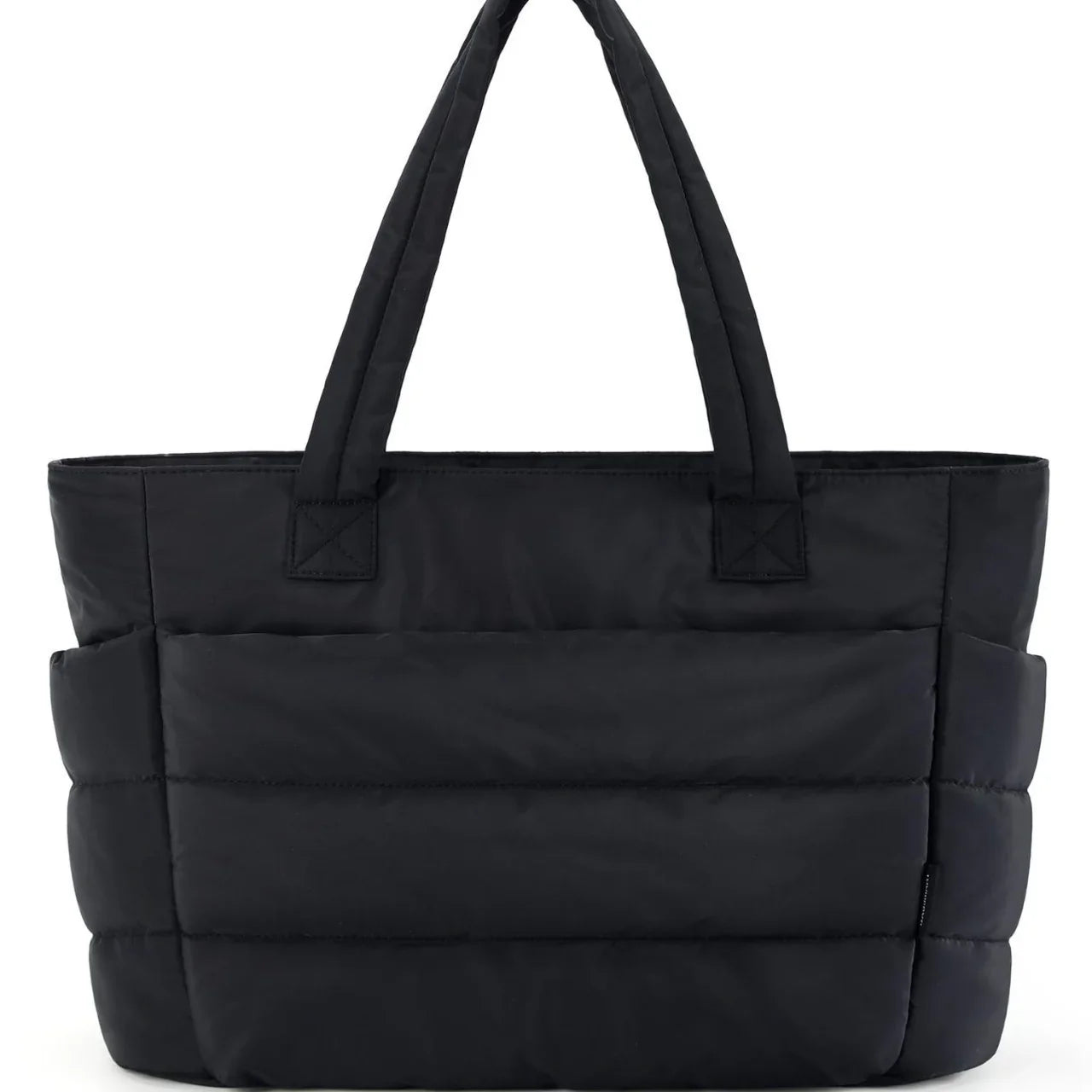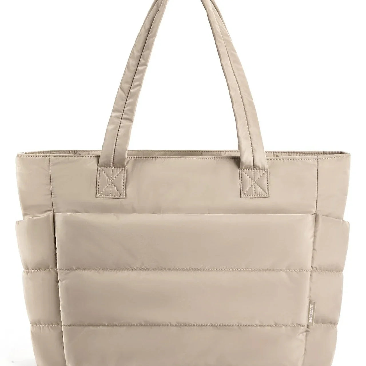 Beige padded tote bag with dual handles and front pocket, minimalist quilted design