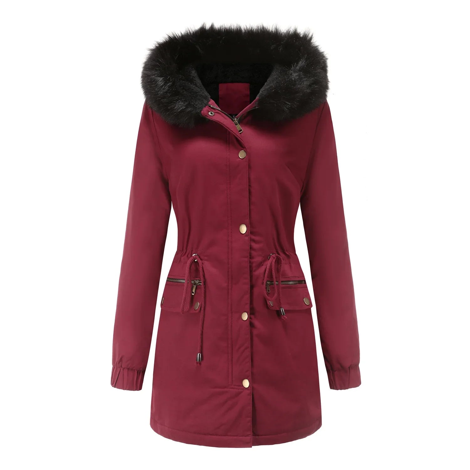Women's maroon winter parka jacket with black faux fur hood and zippered pockets
