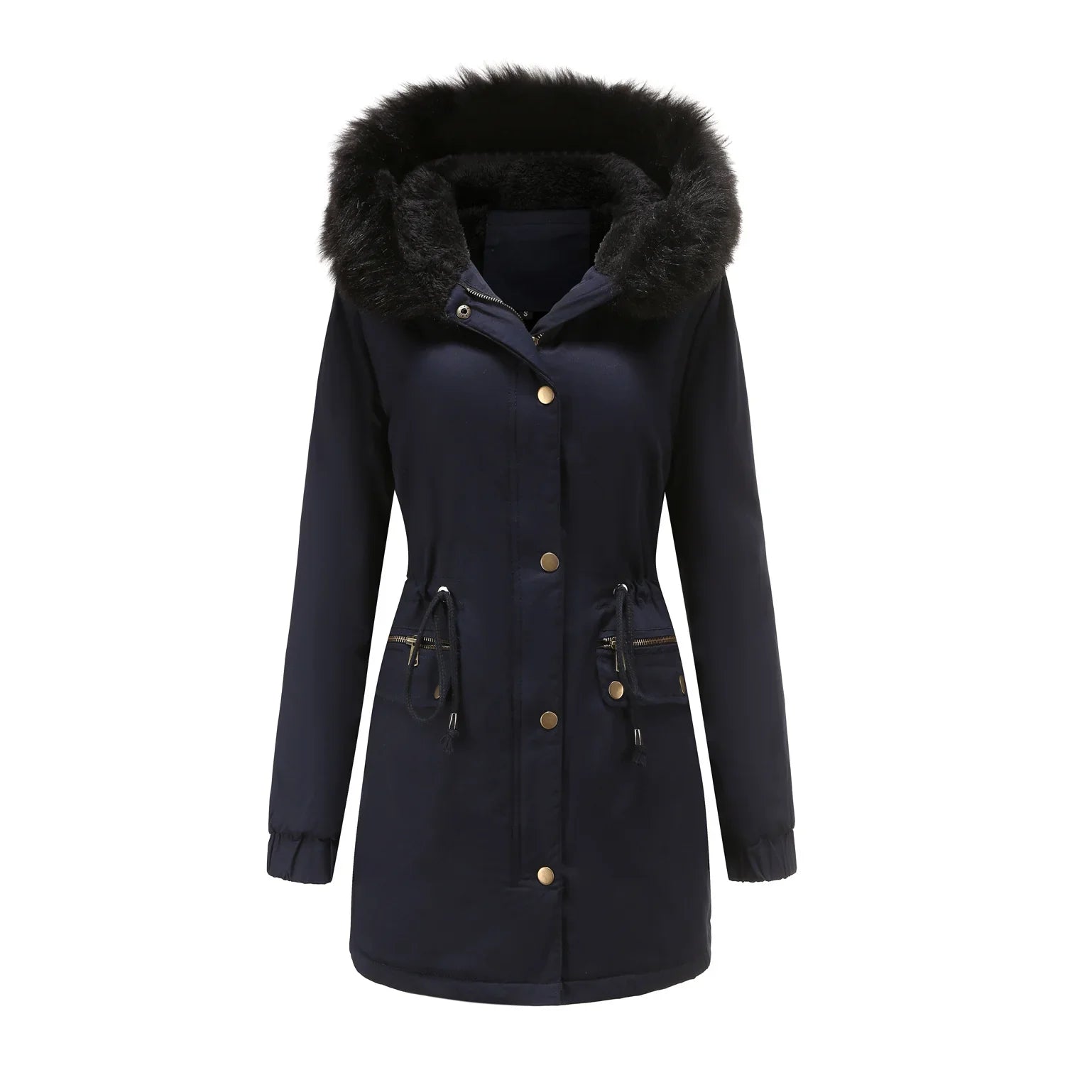 Navy blue women's winter parka with black faux fur hood and drawstring waist