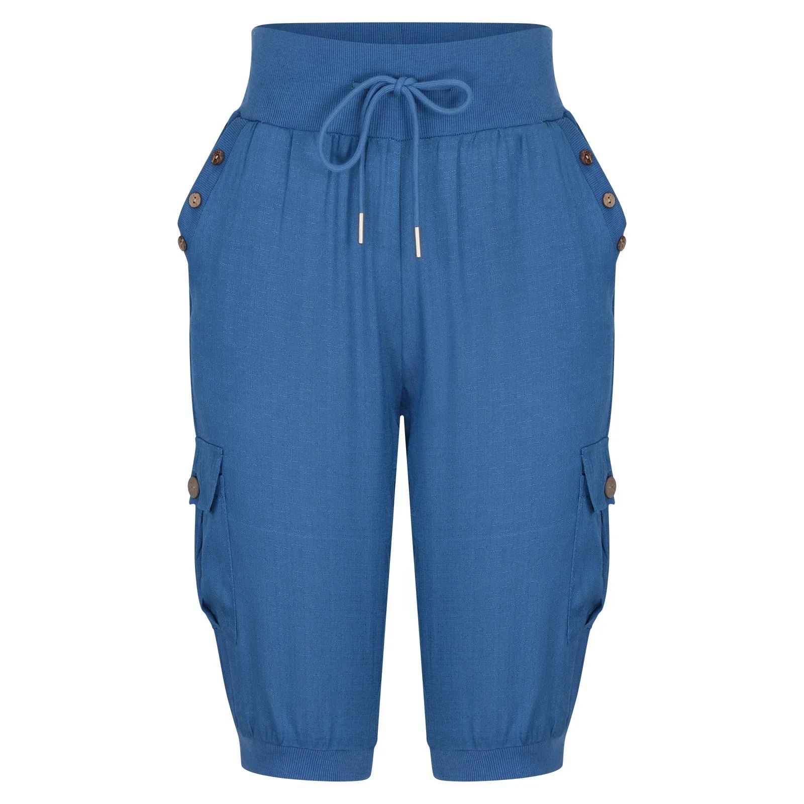 Blue casual women's cargo shorts with drawstring waistband and buttoned side pockets