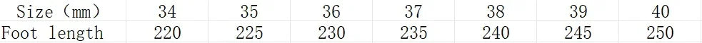 Size chart table showing shoe sizes 34-40 with corresponding foot lengths in millimeters