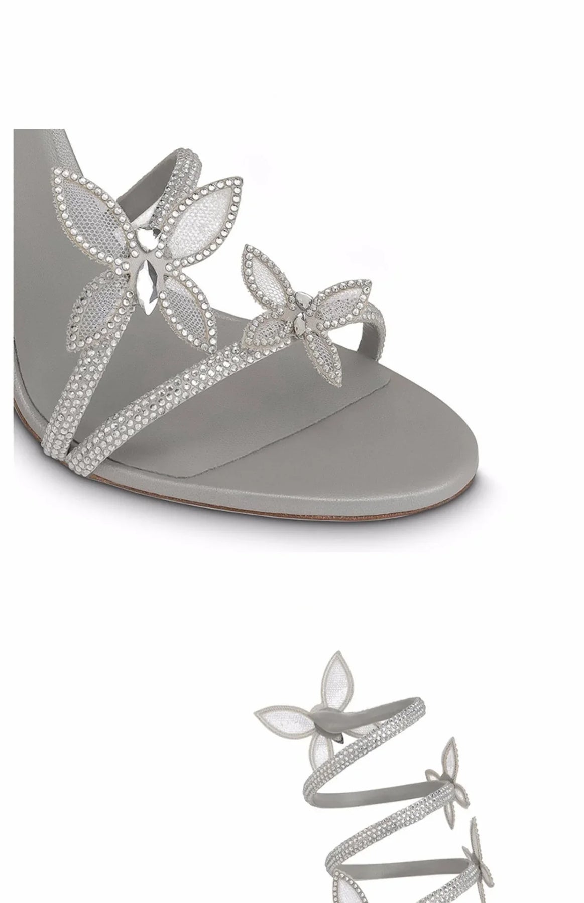 Elegant silver strappy sandal adorned with crystal butterfly embellishments and wraparound design