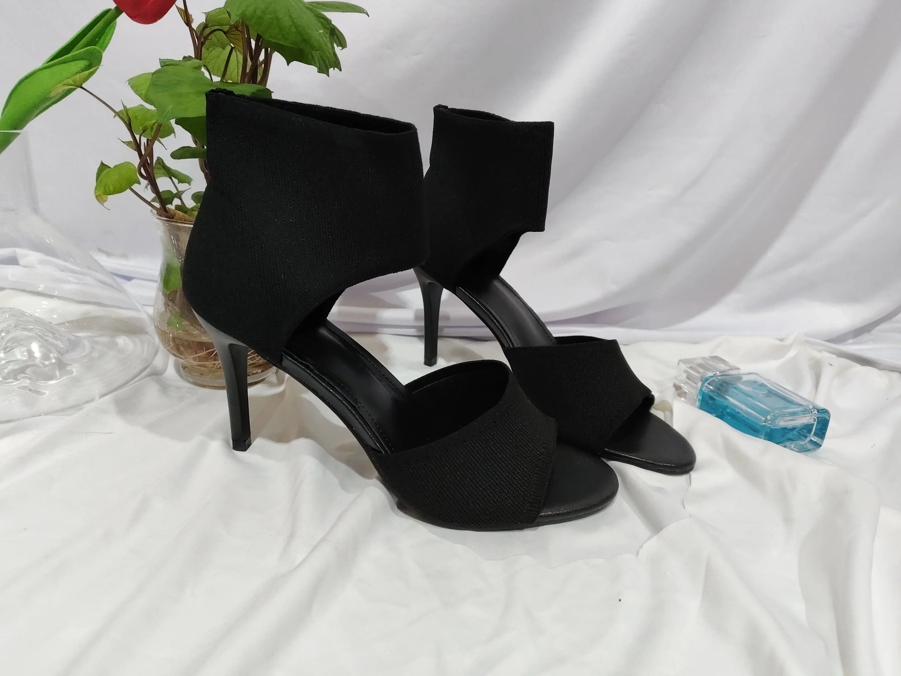 Black high-heeled open-toe ankle boots on model against light background with white column