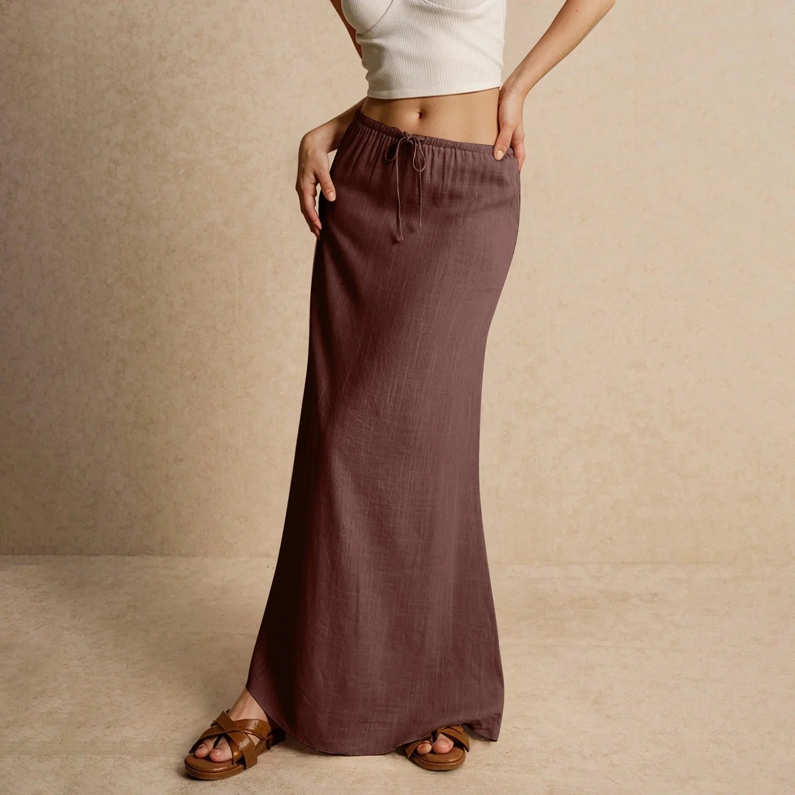 Woman wearing a beige maxi skirt with drawstring waist and brown sandals against a neutral background