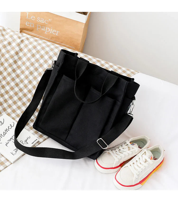 Black canvas tote bag with dual front pockets, detachable shoulder strap, and sturdy handles