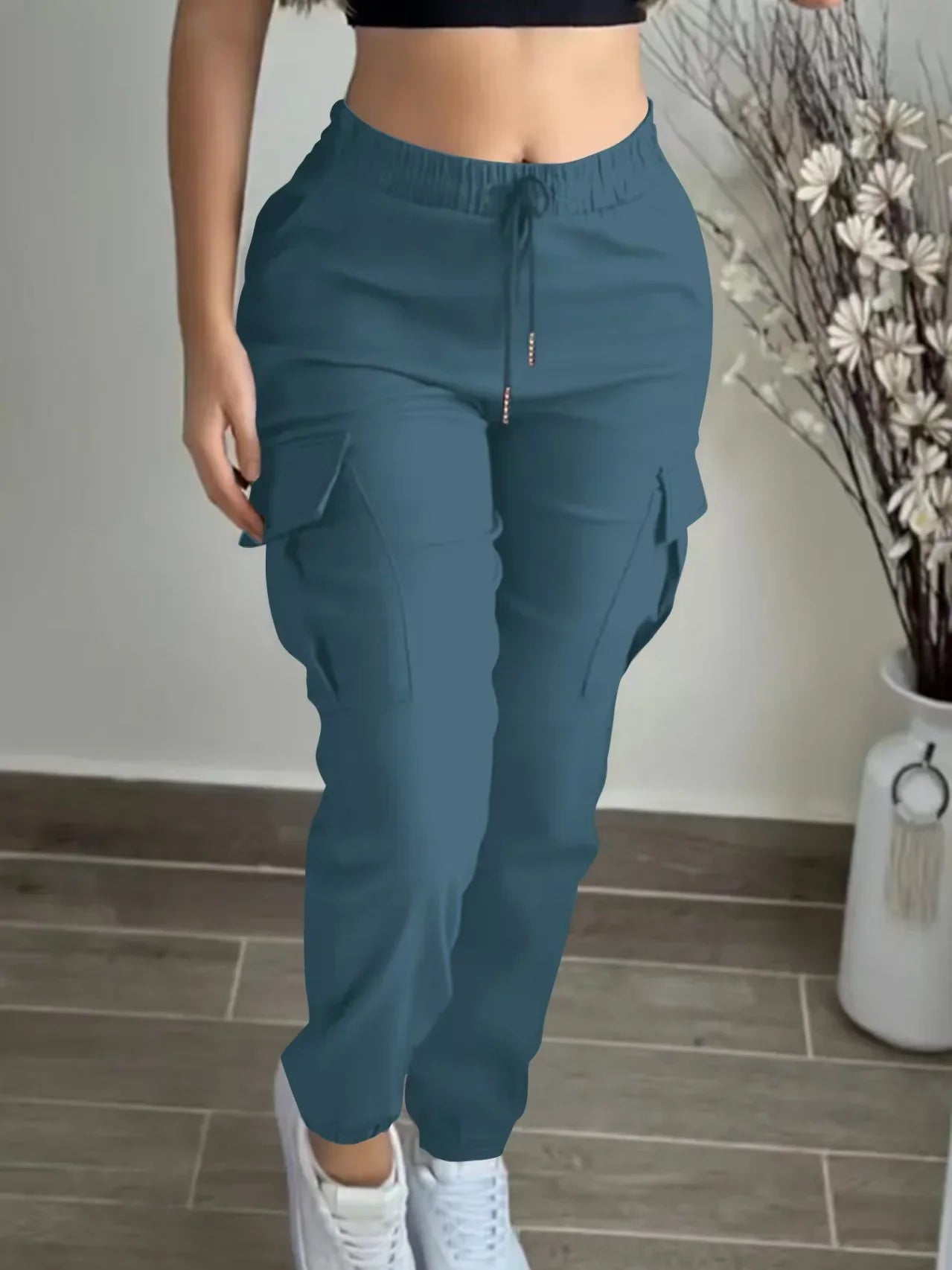 Woman wearing blue cargo pants with drawstring waist and white sneakers standing indoors
