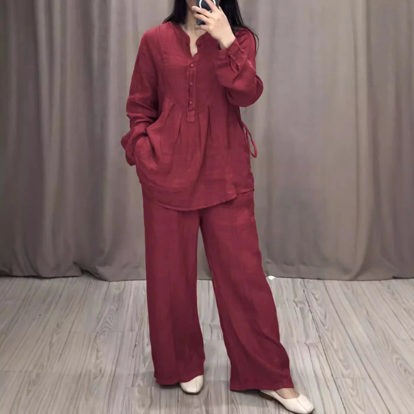 Woman wearing a loose red linen button-up top and matching wide-leg pants with white shoes