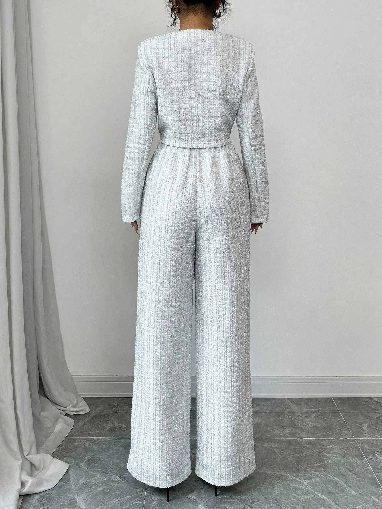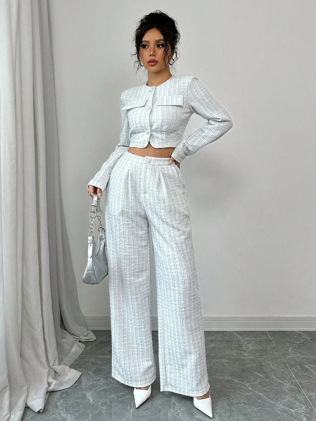 Frühlings- und Herbstanzug mit langen Ärmeln und kurzer Hose, Tweed-Kurzjacke mit Perlmuttknöpfen, elegante, strukturierte Jacke mit Rundhalsausschnitt und Perlmuttknöpfen sowie lange Hose, geeignet für Pendeln, Freizeit, Verabredungen und Urlaub.