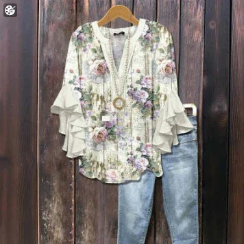 Boho floral blouse with ruffled bell sleeves and blue jeans displayed on wooden background