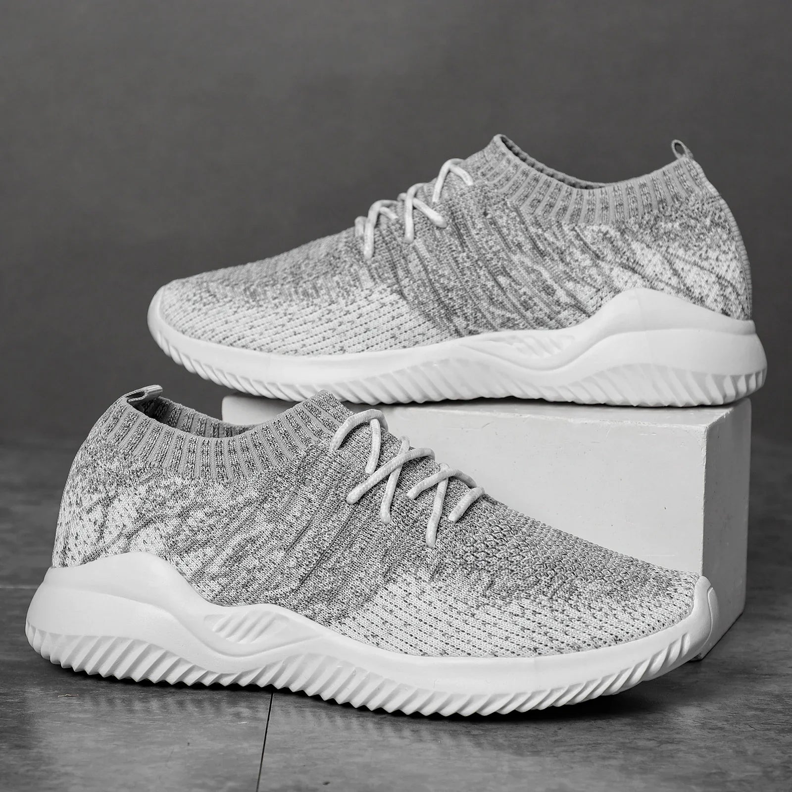 Gray knit sneakers with white sole and black laces displayed on a white block on gray surface