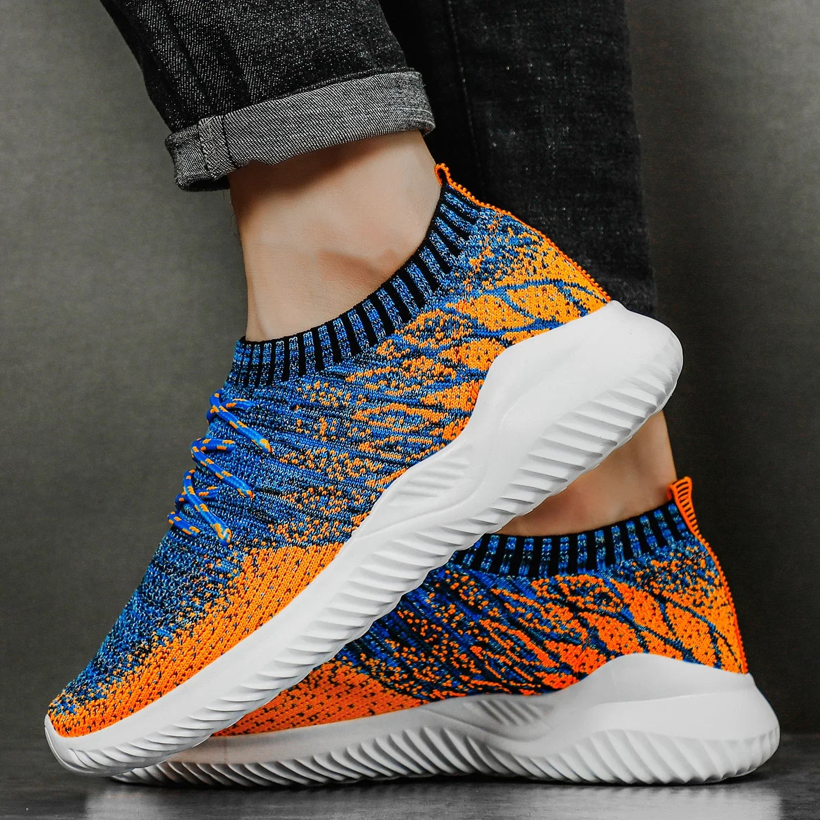 Close-up of orange and blue knit sneakers with white sole, worn with rolled-up black jeans