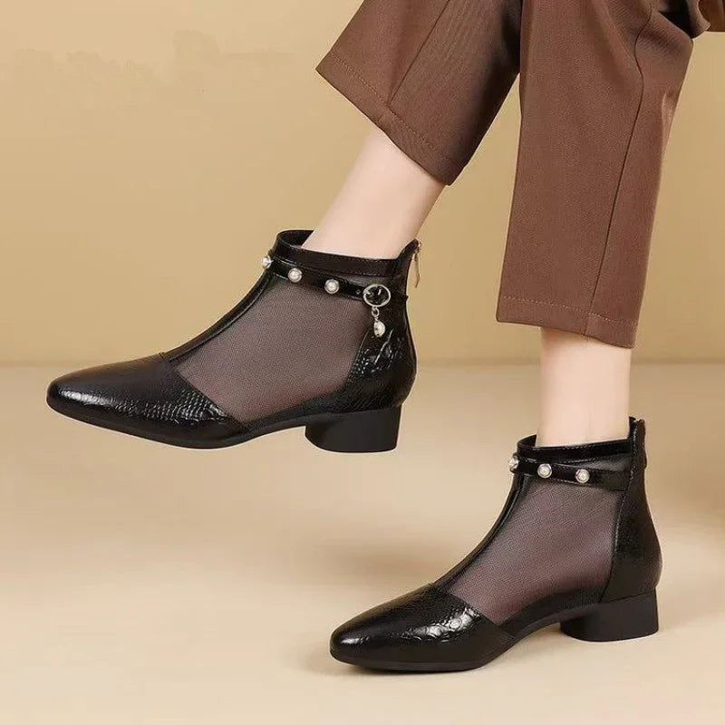 Black mesh ankle boot with faux leather toe and heel, pearl-studded strap, and low block heel