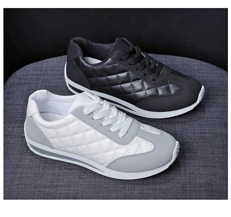 Pair of white and grey quilted sneakers with white laces on dark fabric surface