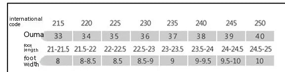Foot size chart showing Ouma international codes with corresponding foot length and width measurements