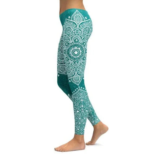 Side view of woman wearing teal mandala patterned yoga leggings with bare feet on white background