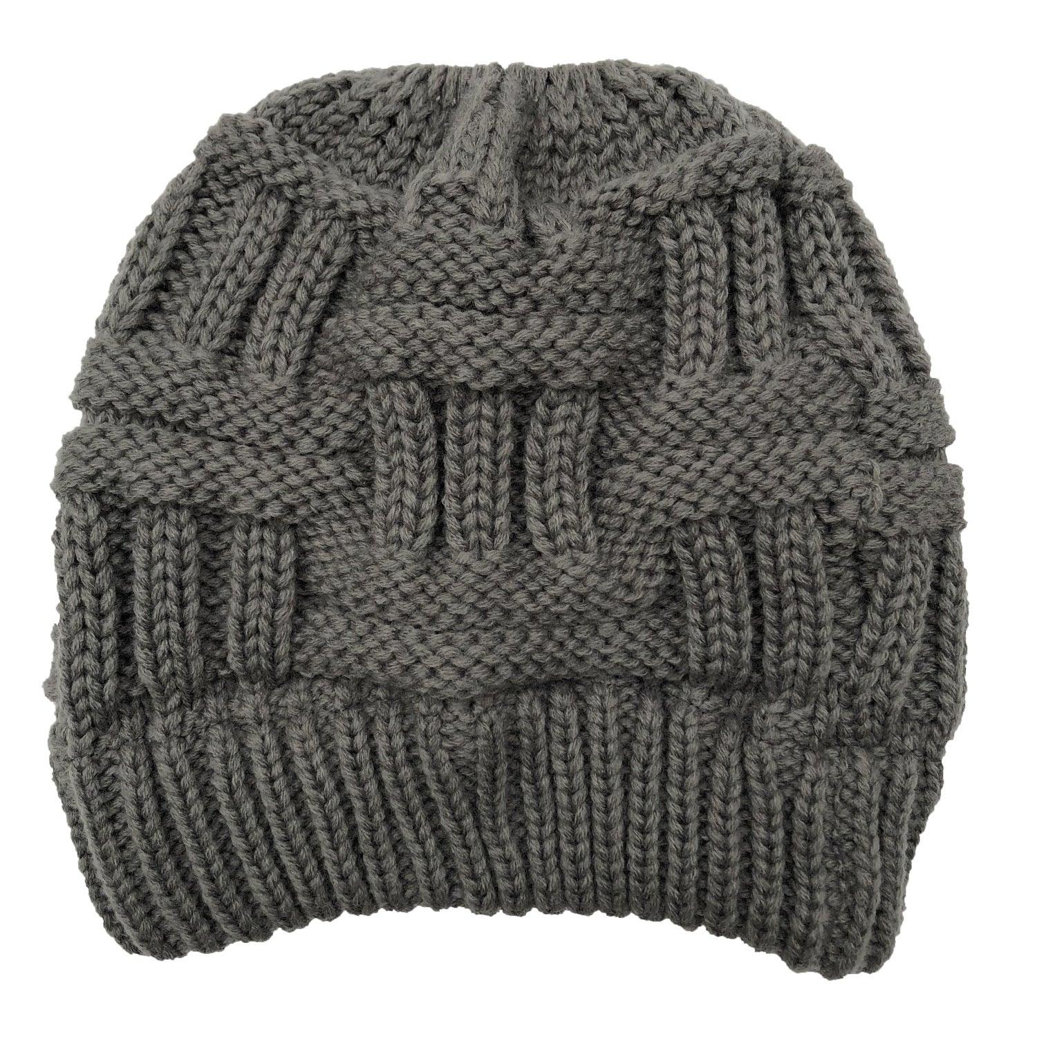 Knit ponytail beanies in black, white, beige, red, gray, and black-white marled colors with stacked knit pattern
