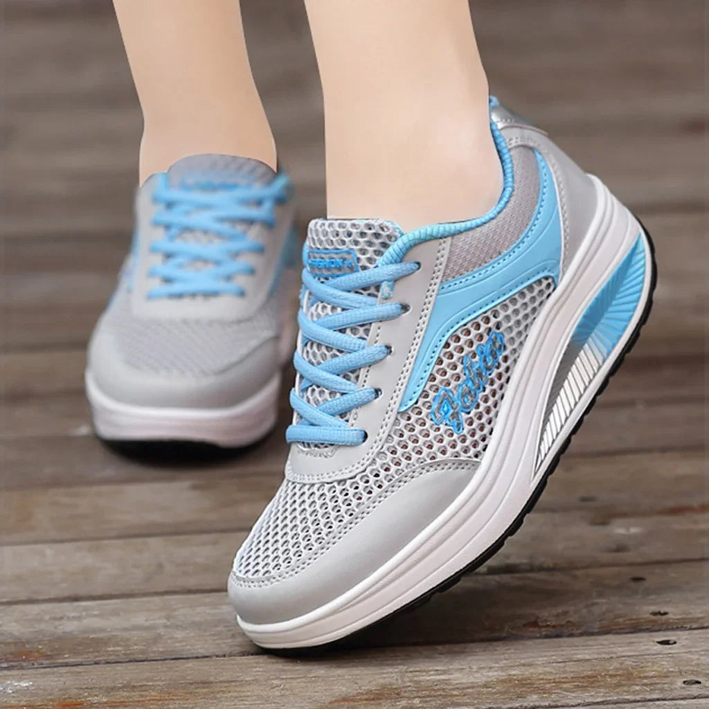 Light gray and blue mesh sneakers with thick white soles worn on wooden floor