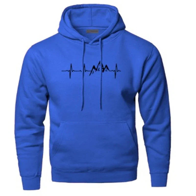Blue hoodie with white heartbeat and mountain design, drawstring hood and front pocket
