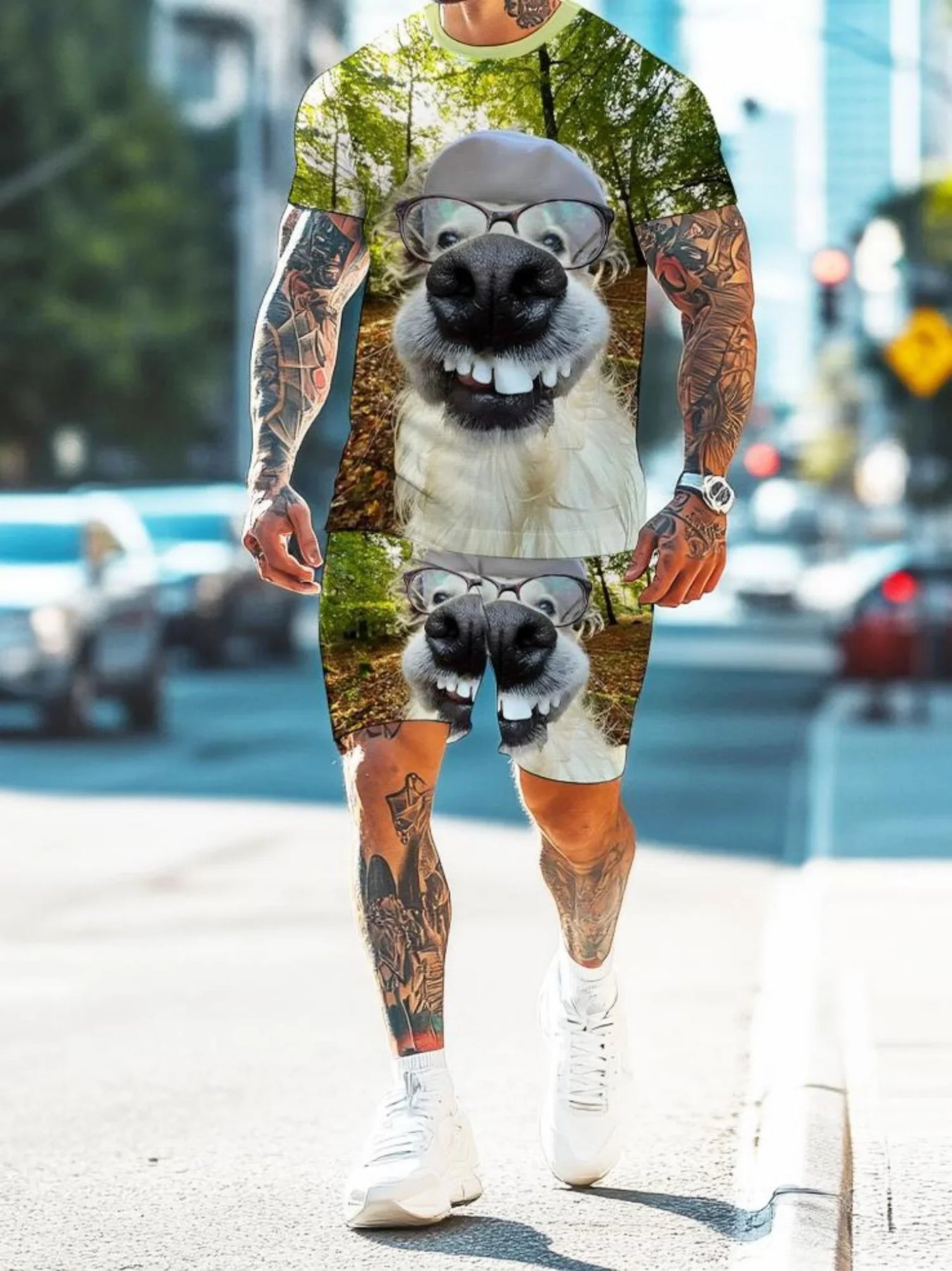 Man with tattoos walking on city street wearing matching shorts and T-shirt set featuring golden retriever dog print