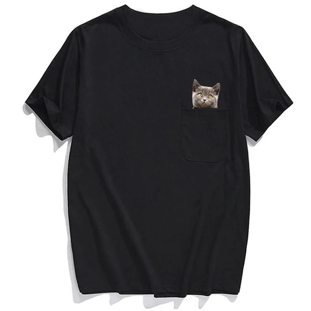 Black T-shirt with a small gray cat peeking out of the chest pocket