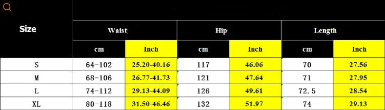 Size chart for women's waist, hip, and length in cm and inches for sizes S to XL with highlighted inch values